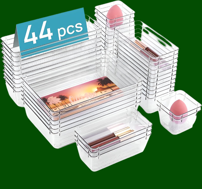 Buy nowStreamline your drawers with the Vtopmart 44-Piece Clear Plastic Organizer Set. Featuring four versatile sizes, these non-slip trays are perfect for tidying up makeup, jewelry, kitchen utensils, and office supplies. Their clear design ensures quick identification of contents, making organization effortless.