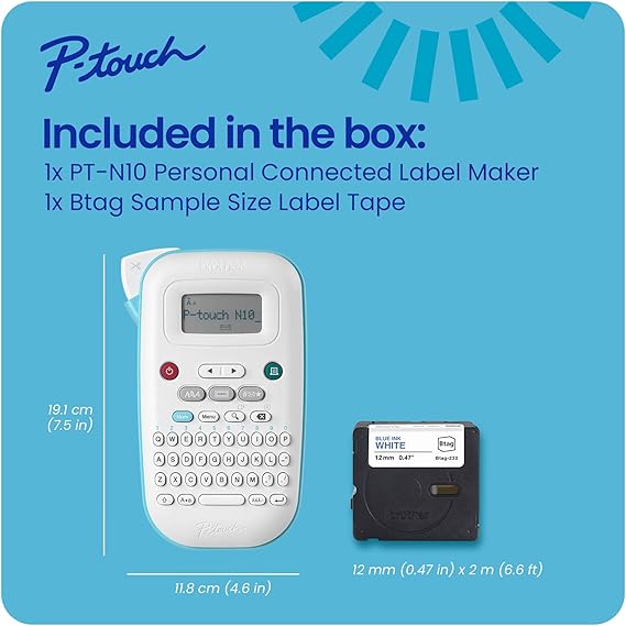 Buy nowStay organized effortlessly with the Brother P-touch PT-N10 Handheld Label Maker. This portable, easy-to-use label printer features multiple fonts and includes Btag tape for clear, professional labeling. Perfect for home, office, and storage needs!
