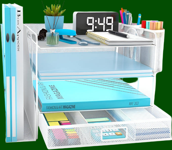 Buy nowTransform your workspace with our sleek 4-Tier Desk Organizer in white, featuring a file holder, letter paper trays, and a convenient drawer to keep your documents and supplies neatly arranged. Designed to enhance productivity and add a touch of elegance to any office setting, this organizer ensures your essentials are always within reach.