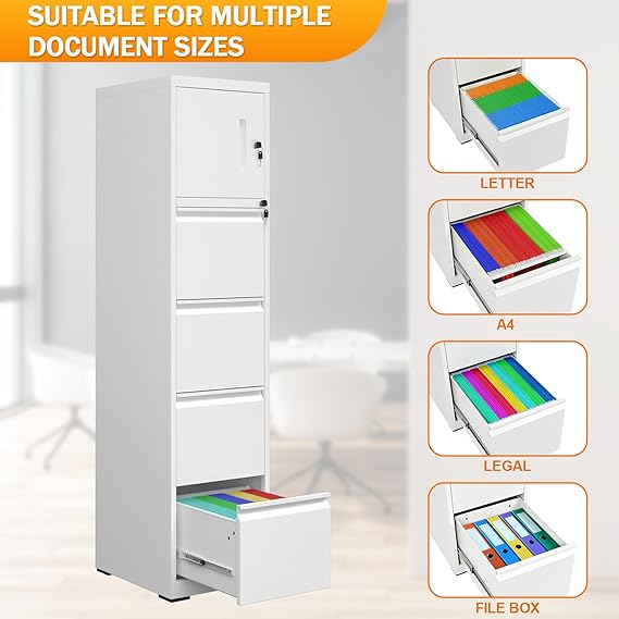 Buy nowThe Livofloral Vertical File Cabinet offers versatile storage with four deep drawers and a top cabinet, each secured with separate locks for enhanced confidentiality. Adjustable rails accommodate various file sizes, while the anti-tip system ensures safety. Constructed from durable steel, it promises longevity and easy maintenance. Assembly is straightforward with included instructions.